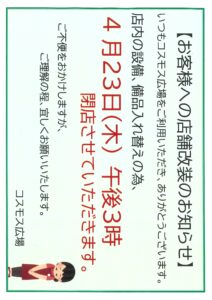 店舗改装工事に伴う閉店時間について(4月23日は15時閉店)